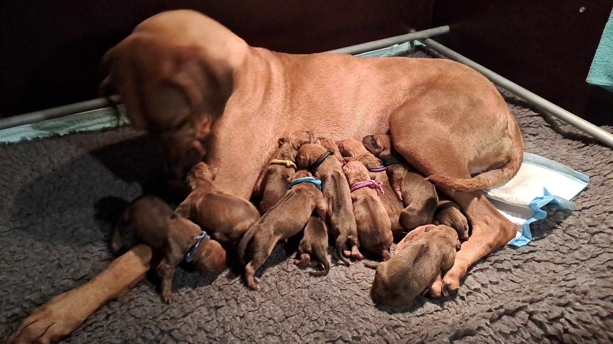 Skajínka se stala znovu babičkou a my jsme hrozně vděční, jak byla Juna (vrh C Gaudiwa Musana) šikovná a statečná. Juna to vzala opravdu hopem a za 4h a 20 minut přivedla v Holandsku na svět 12 štěňátek – 7 pejsků, 5 feneček.